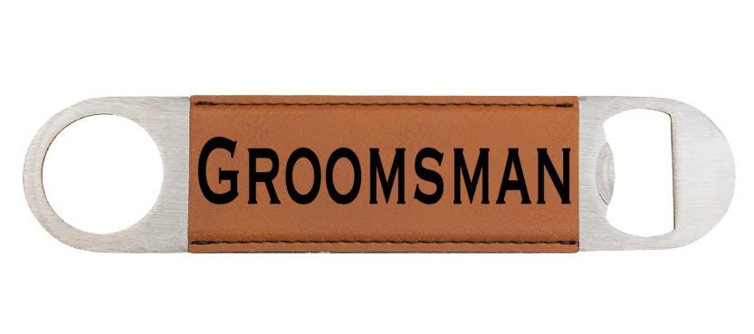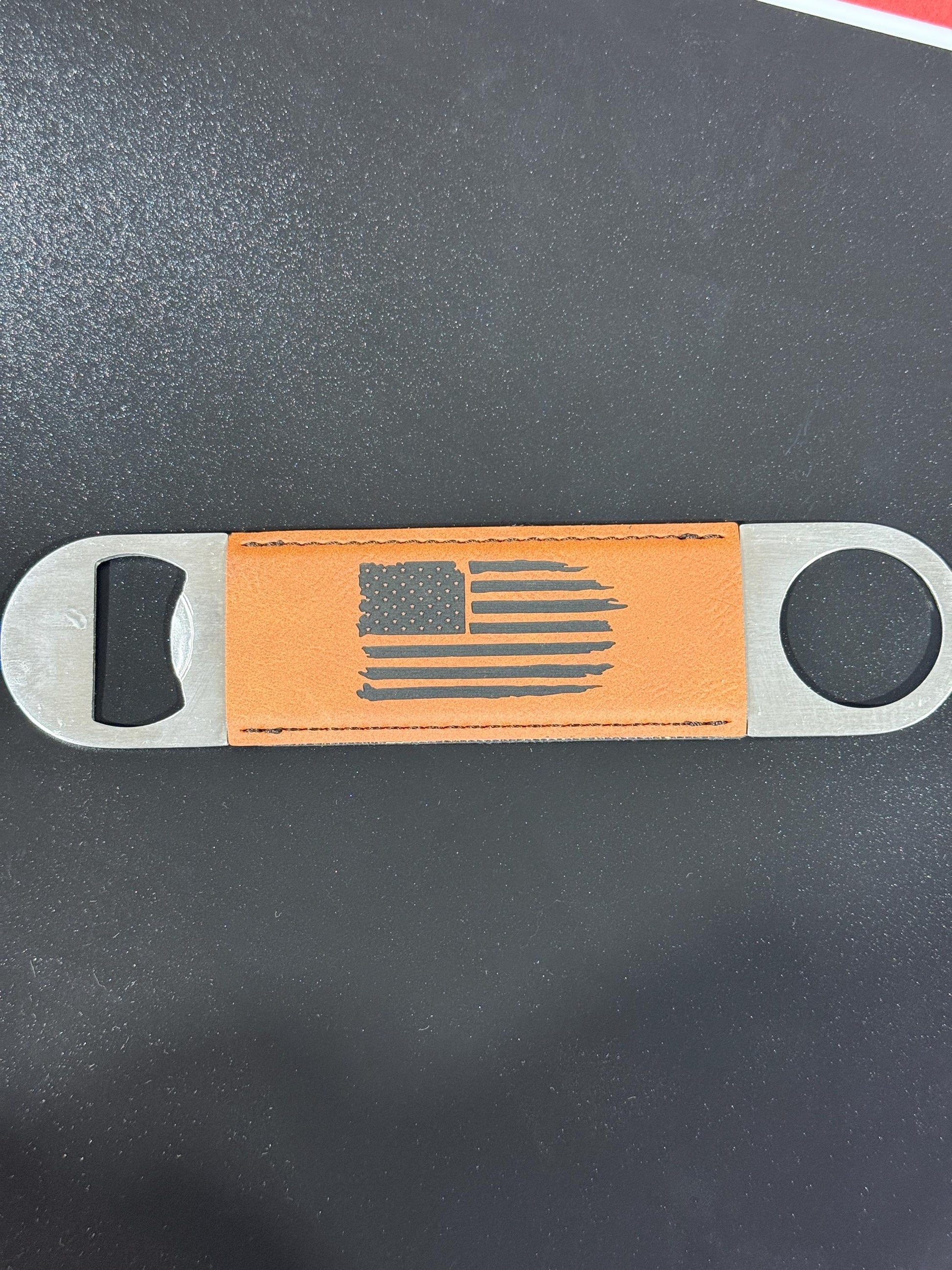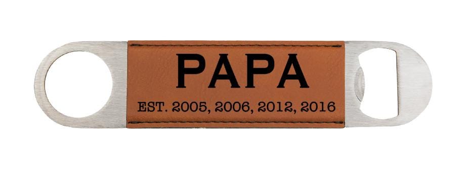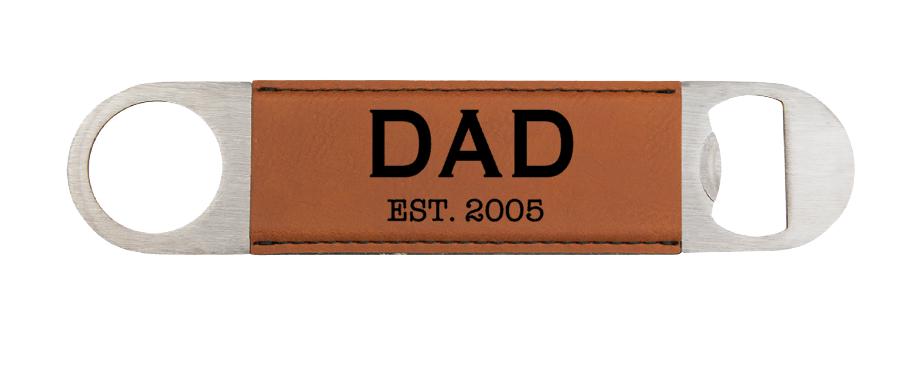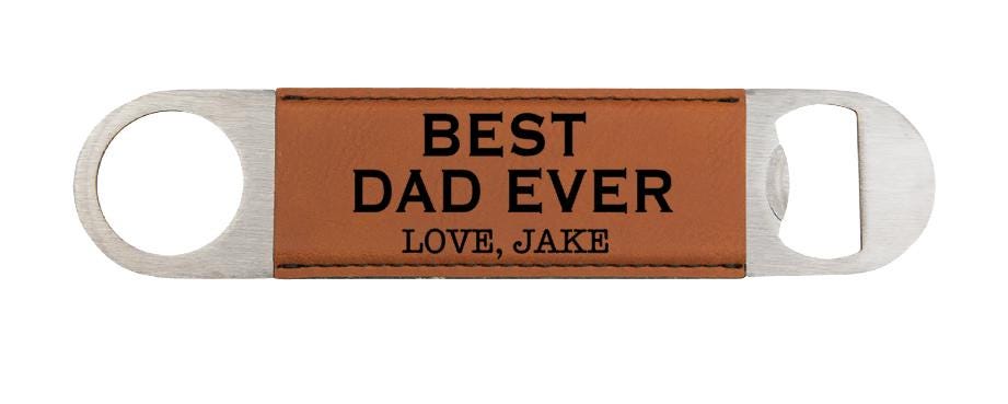 Laser engraved leatherette bottle opener. Approx 6.5" x 1.5". Perfect for fathers day, mothers day, birthday and grooms gifts.
