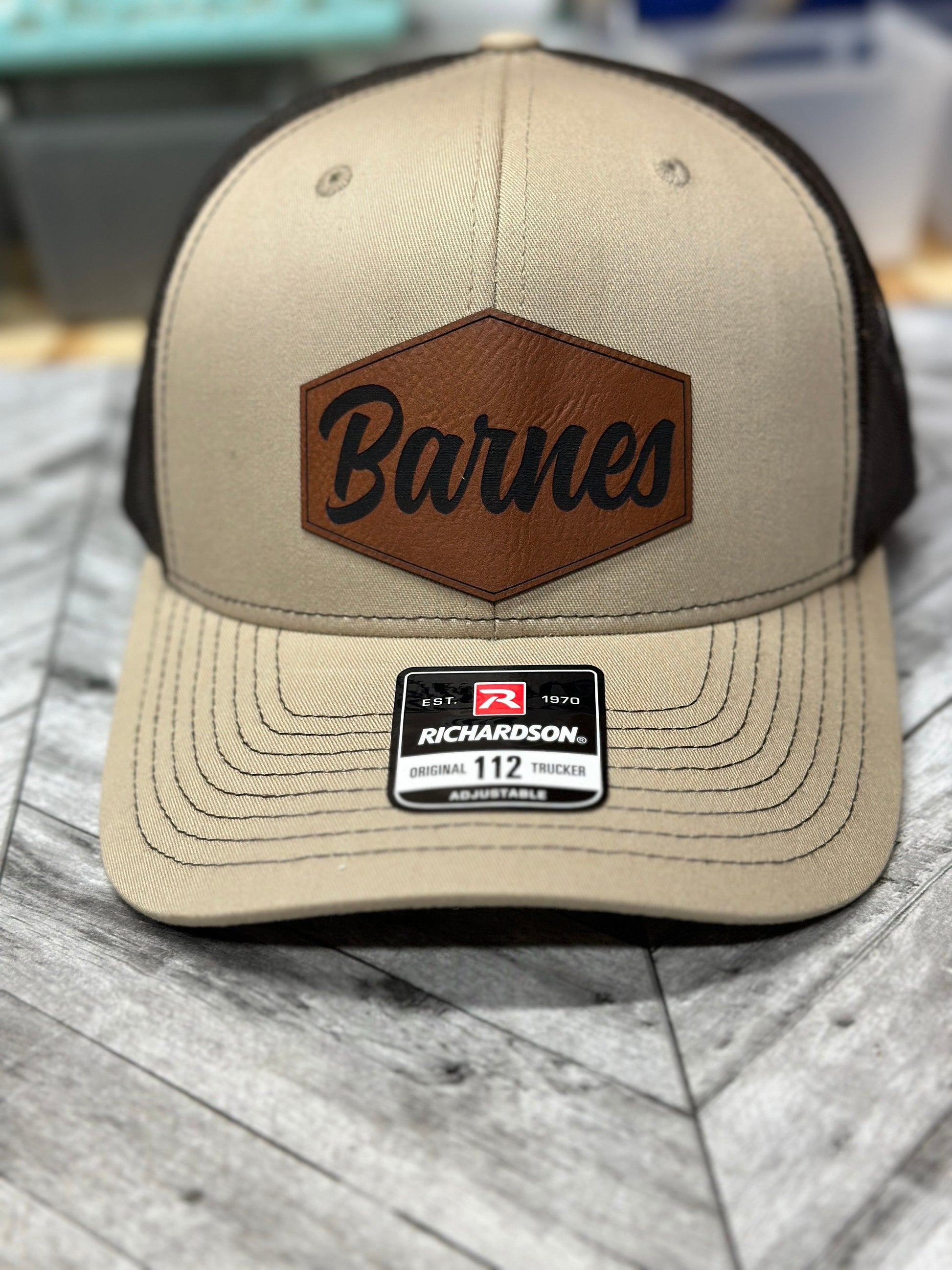 Get your name, any name on a leatherette engraved patch, that is heat pressed onto hat.