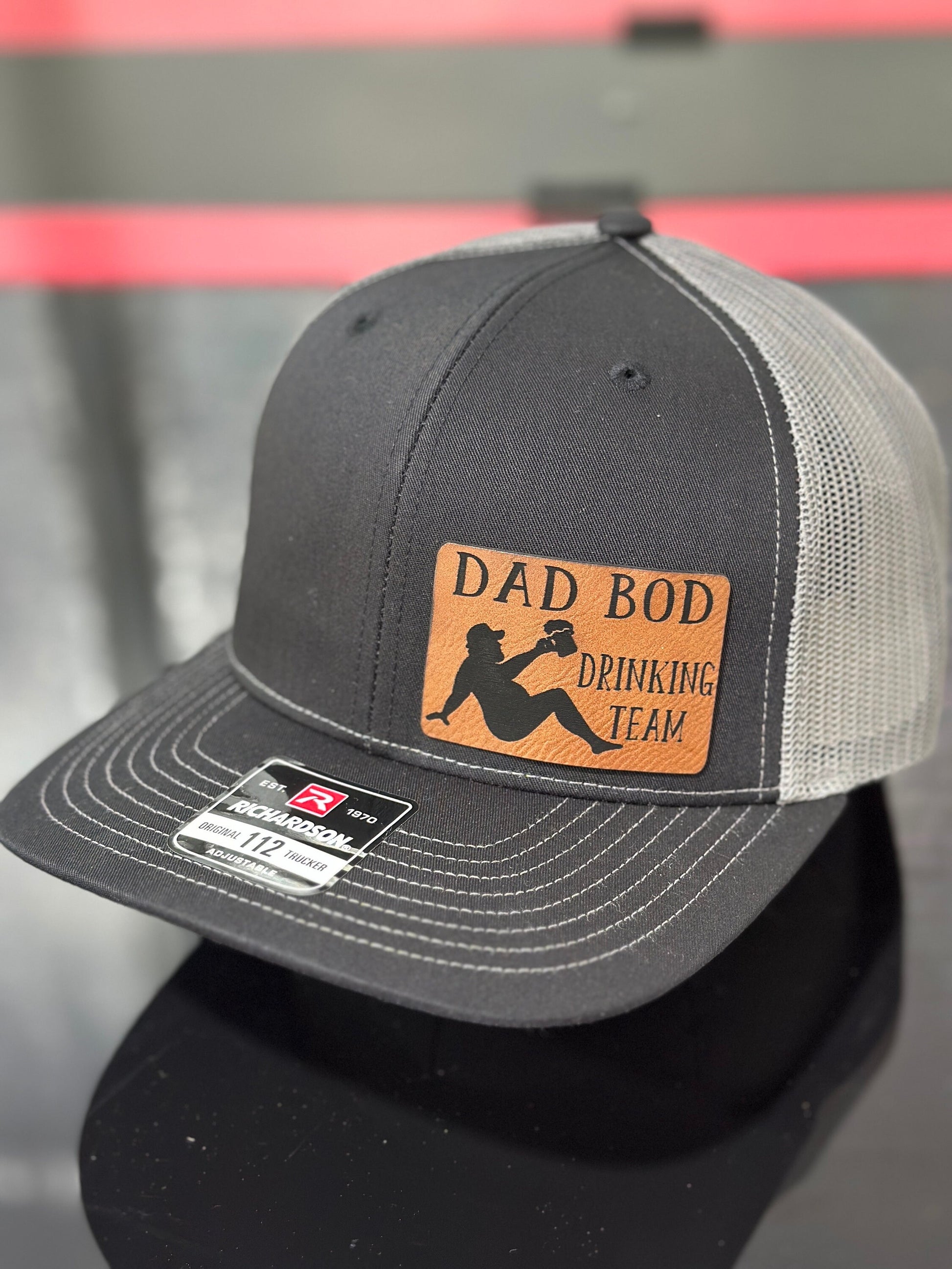 Dad bod Drinking team leatherette engraved patch, that is heat pressed onto hat.