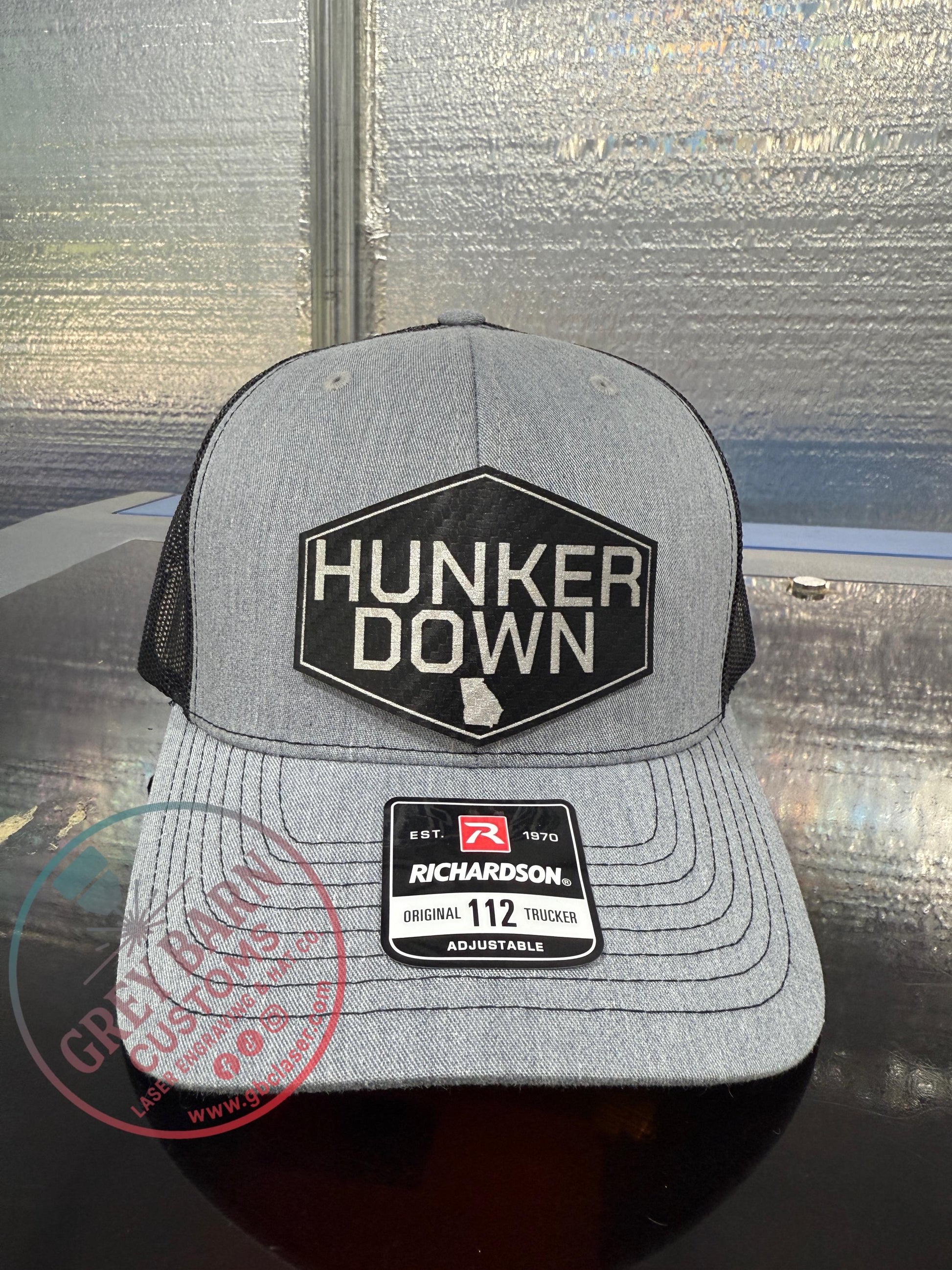 Hunker Down, laser engraved red/ black OR Black/Silver leatherette patch, heat pressed on hat.