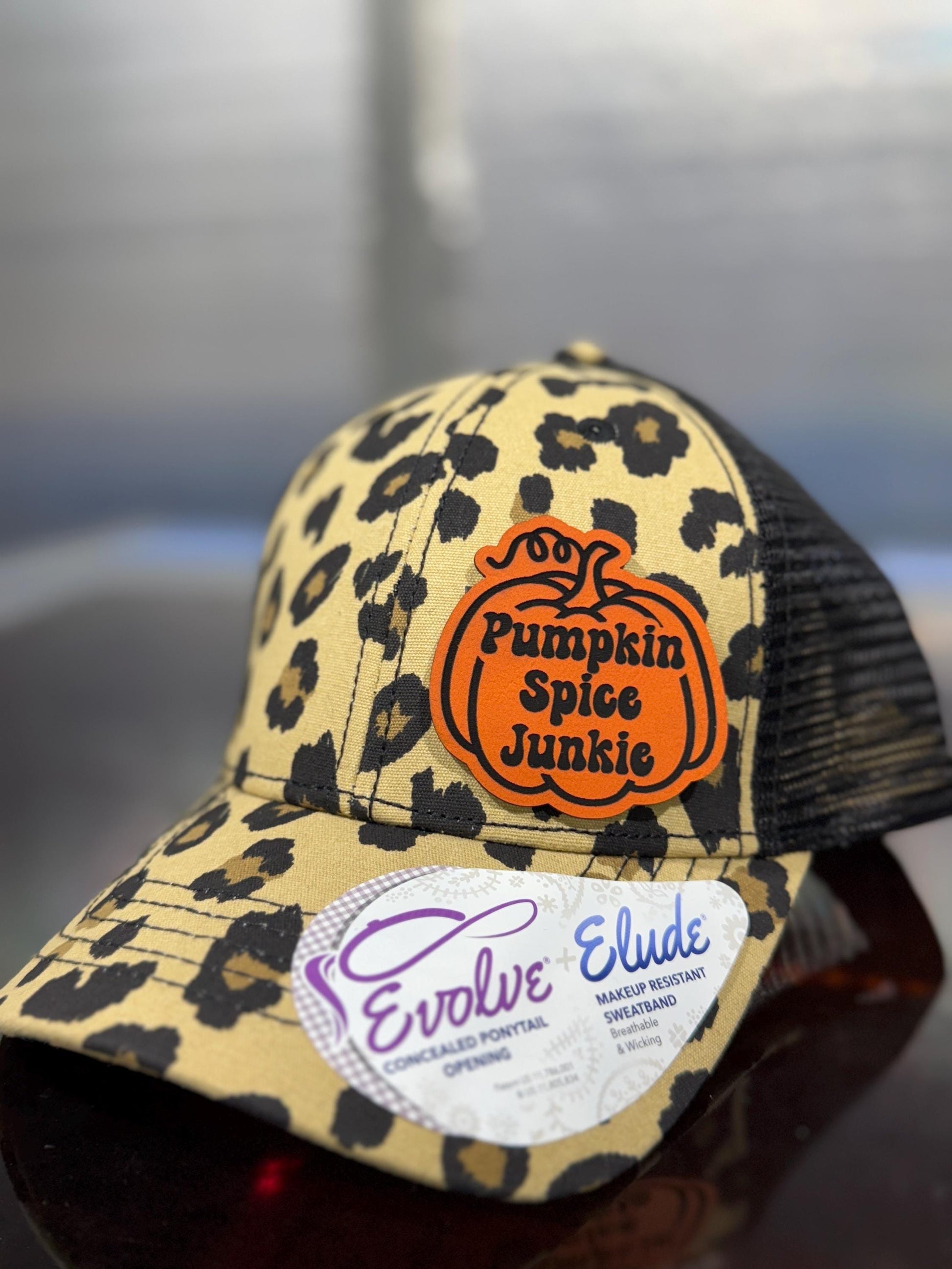 Pumpkin Spice Junkie orange leatherette engraved patch, heat pressed onto hat.